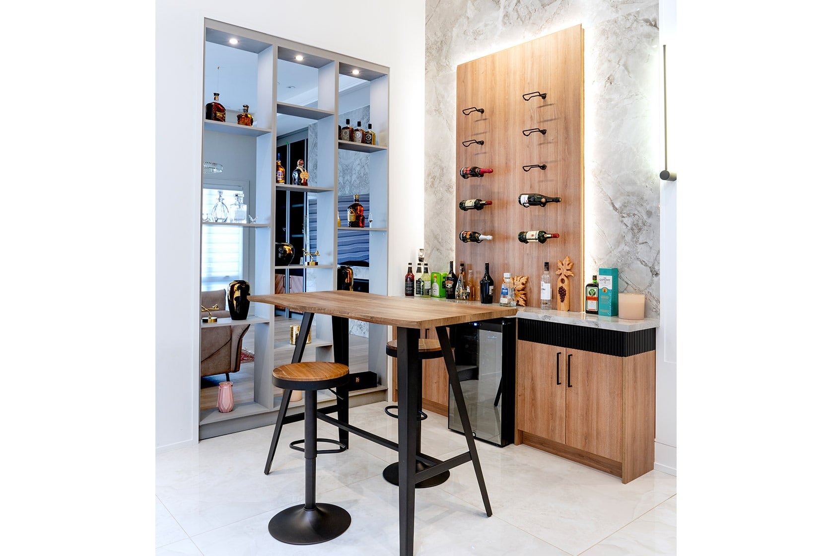 Our team specializes in custom bar designs, including cabinetry, countertops, and finishing. Perfect for residential entertainment areas or commercial spaces, we create bars that combine elegance, functionality, and durability.