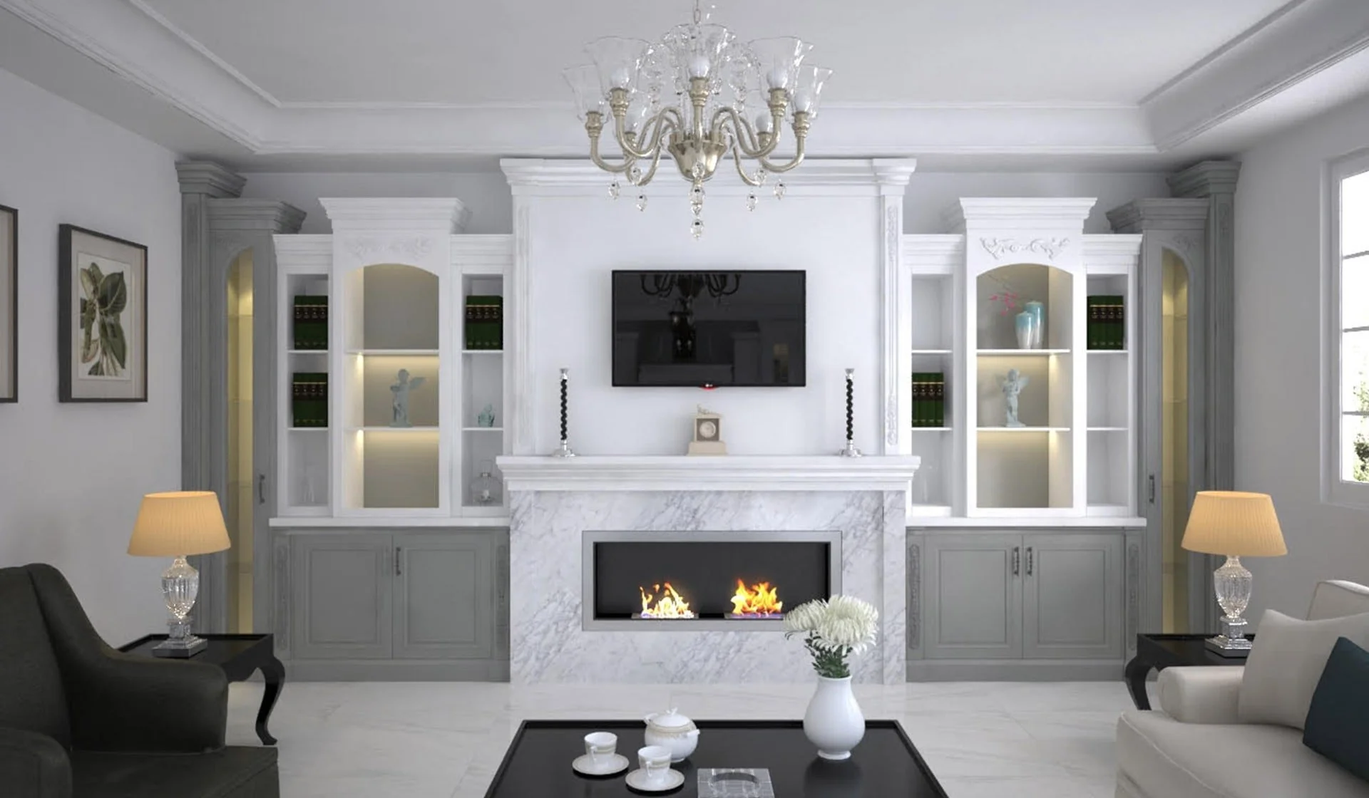 Modern living room with a fireplace centered on a white marble wall. Flanked by blue shelves filled with books, and natural light coming from a window on the left. Two white armchairs and a coffee table with decorative items are in the foreground.